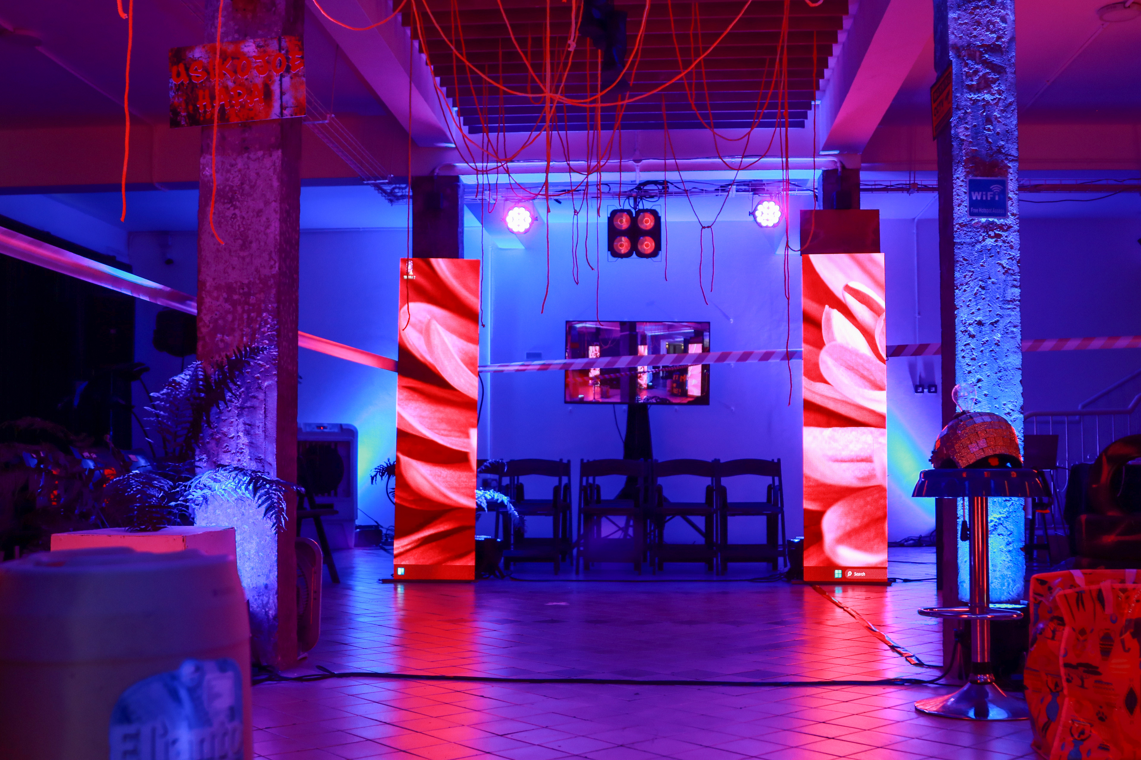 Once the videos were ready, I made another decision. I did not want a single clean screen. I wanted fragmentation. So we broke the screen. The visuals were split and connected across multiple screens, arranged around the columns, creating one continuous image that wrapped the space rather than sitting in front of it.